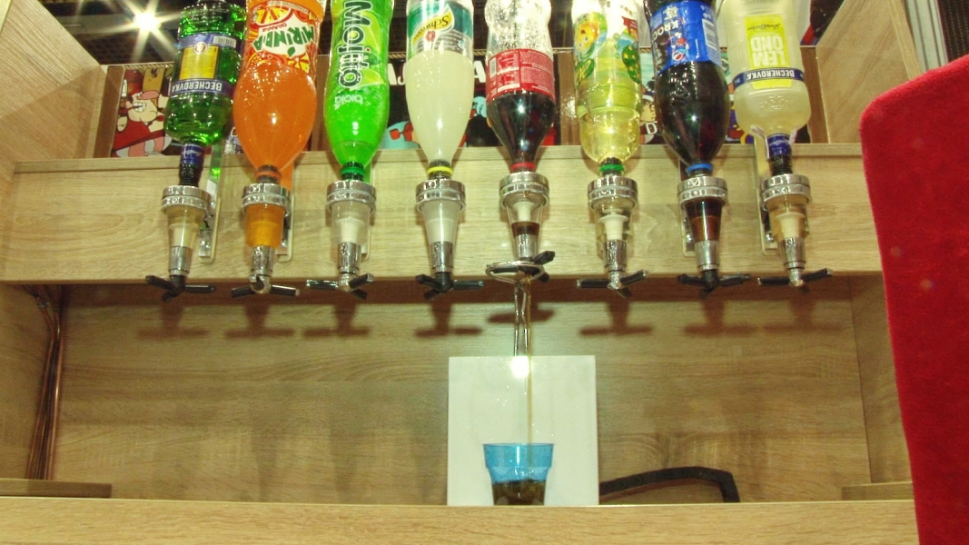 «Виски с содовой»: стакан подъезжает по очереди к двум бутылкам, делая случайным образом ваш неповторымый коктейль.