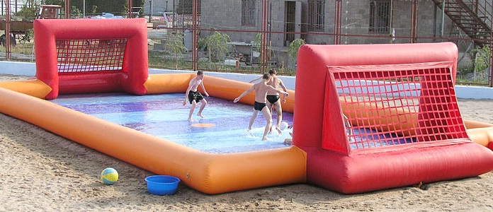 Игра в футбол внутри этого надувного поля, залитого водой, превращается в настоящее веселье и экстрим! Поле скользкое, игроки мокрые, а их ноги создают брызги во все стороны при попытке ударить по мячу – и при этом все довольны и счастливы.